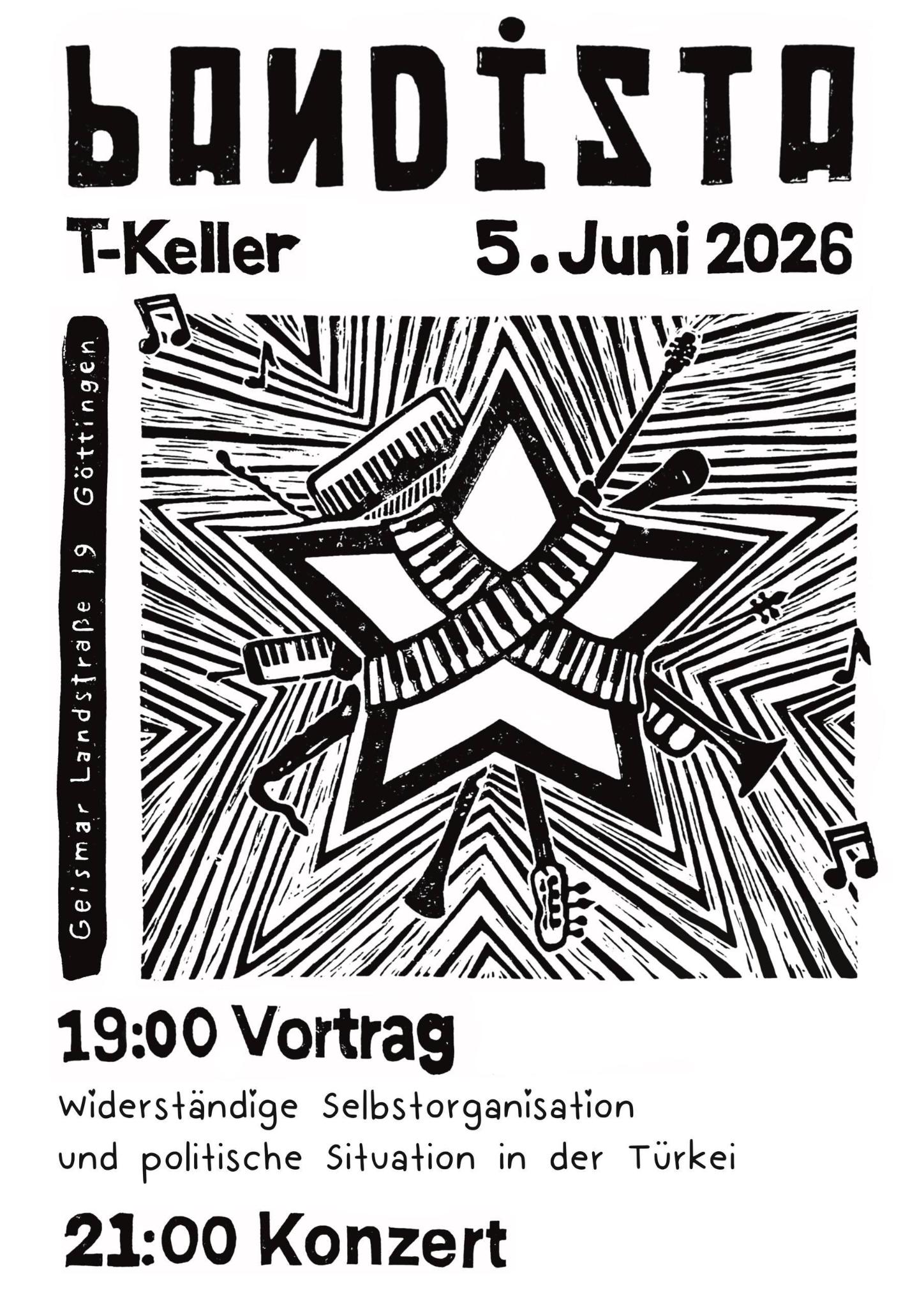 Bandista sind ein linkes Musiker*innen-Kollektiv aus Istanbul, Berlin und anderen Orten. Sie machen seit 2006 ihren unverwechselbaren „Bosporus Mestizo“-Sound und singen in ihren Texten auf Türkisch, Kurdisch und Englisch u.a. über Kapitalismus, Polizeigewalt, Migration und Gentrifizierung. Schon bei den Gezi-Protesten 2013 in der Türkei haben unter anderen Bandista die Verhältnisse zum Tanzen gebracht, in Göttingen zuletzt 2023 mit einem unvergesslichen Abend im T-Keller.