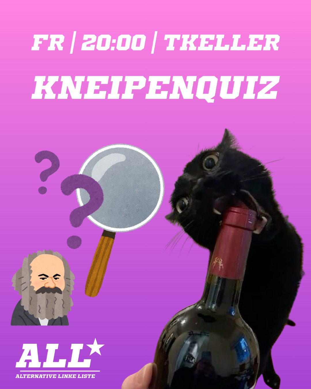 Am Freitag gibts ein Rätselraten im TKeller und außerdem wird das Rätsel gelüftet, warum die ALL (Alternative Linke Liste) eigentlich Politik an der Uni macht und denkt, dass das wichtig ist. Wir freuen uns auf euch!